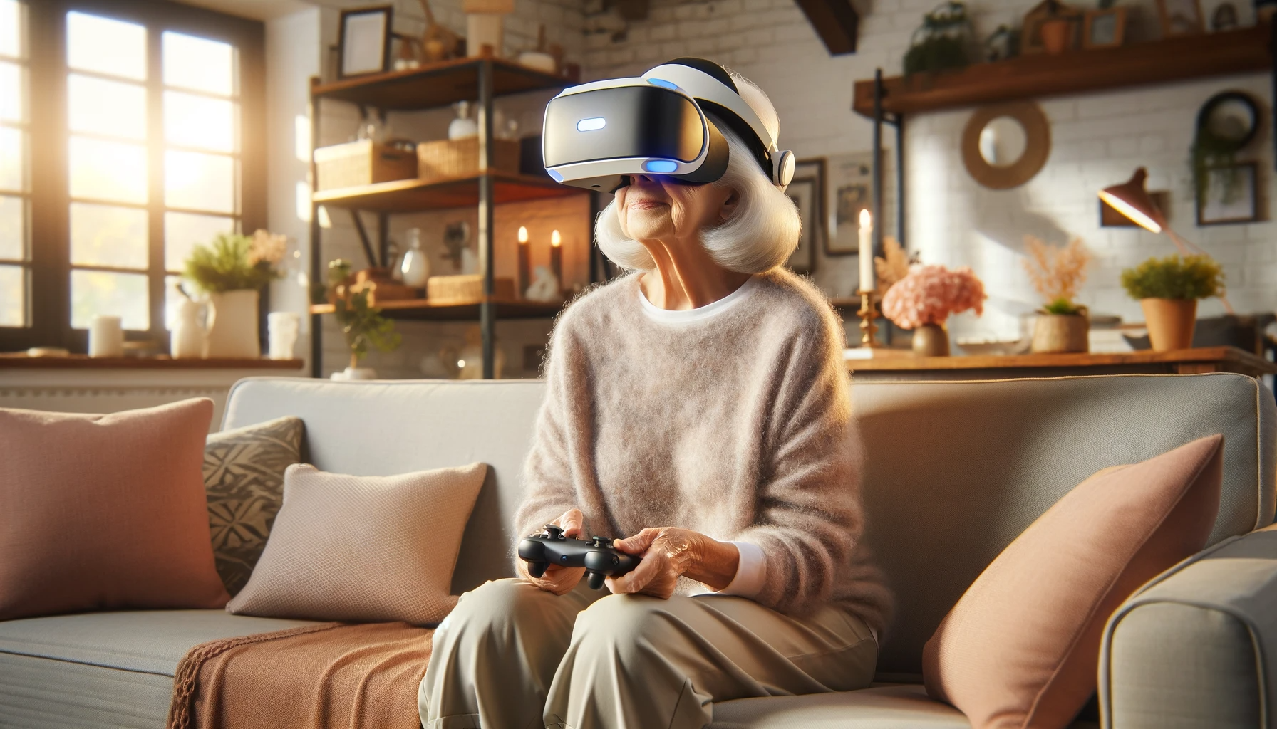 DALL·E-2024-01-19-08.40.53-A-horizontal-image-of-an-elderly-woman-sitting-on-a-sofa-using-a-VR-headset.-The-setting-is-a-cozy-living-room-with-warm-lighting-and-comfortable-fu