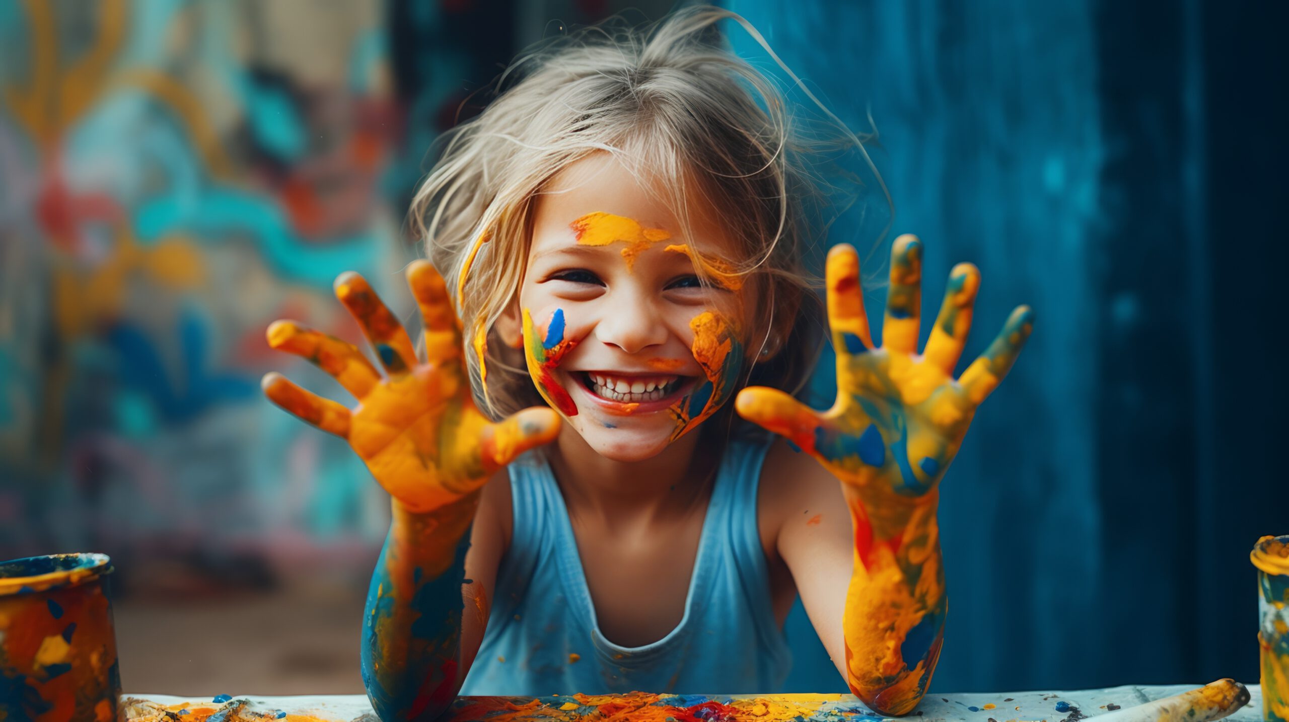 funny child girl draws laughing shows hands dirty with paint, concept joy of life