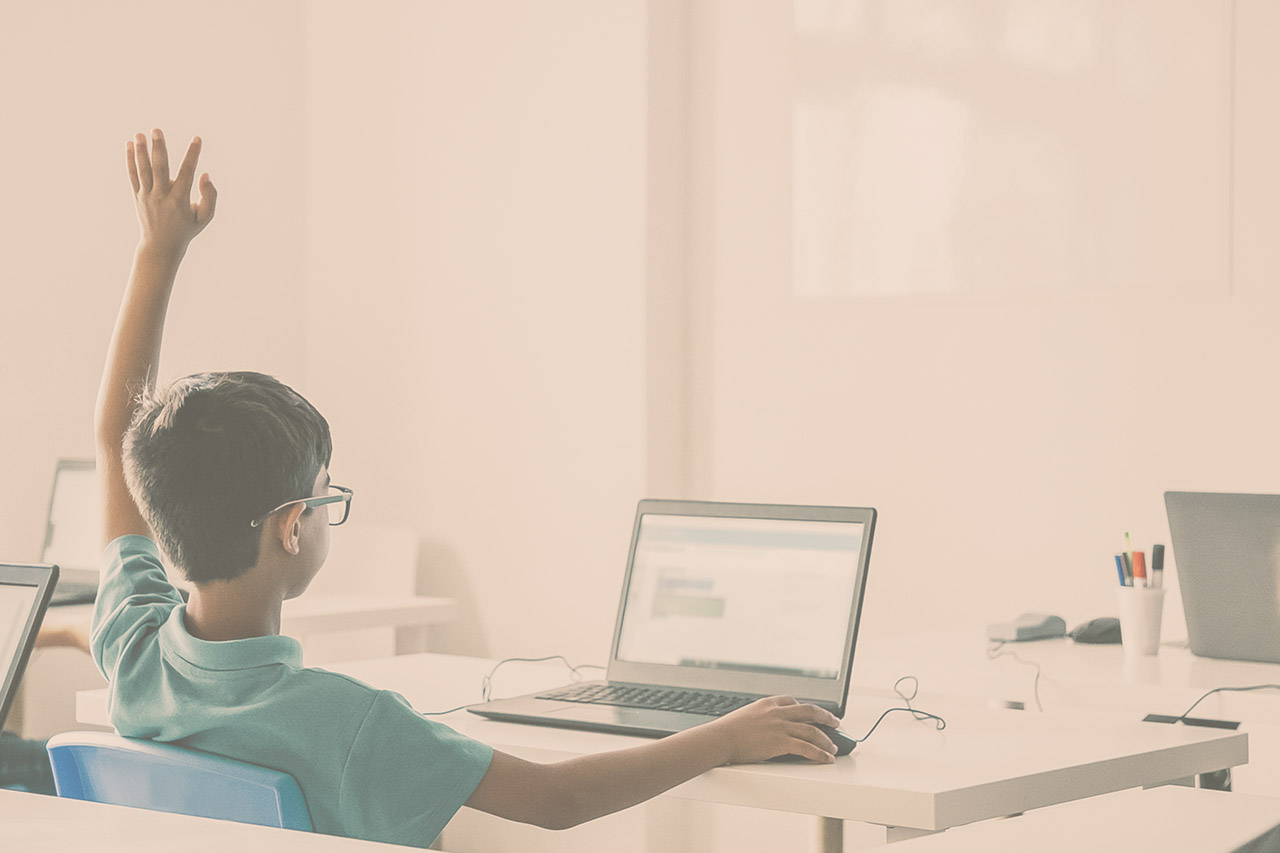 Mixed-race boy in glasses rising hand for answer during lesson